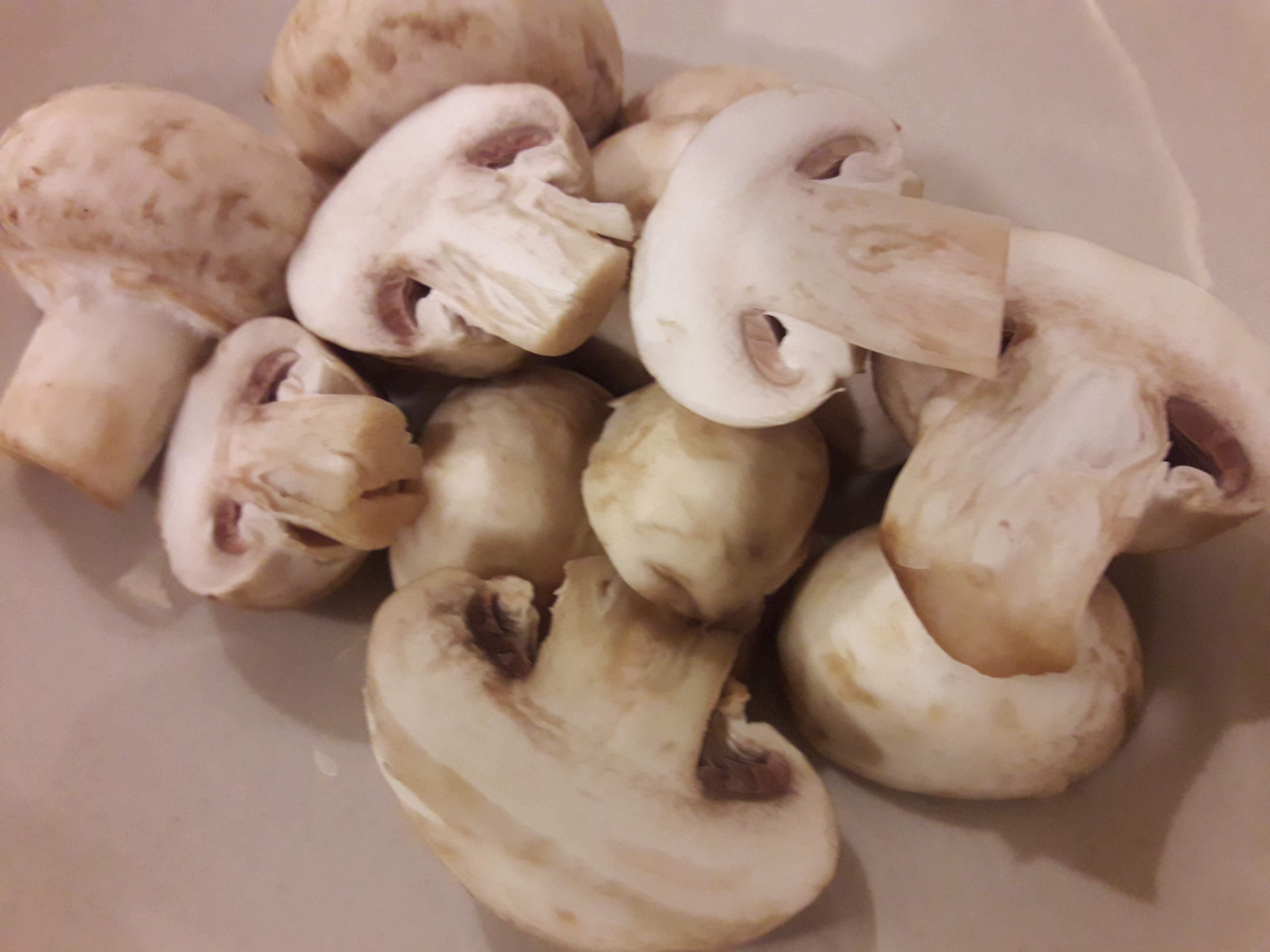 - 400 grams (approx 1 pound) button mushrooms, cleaned and cut in half