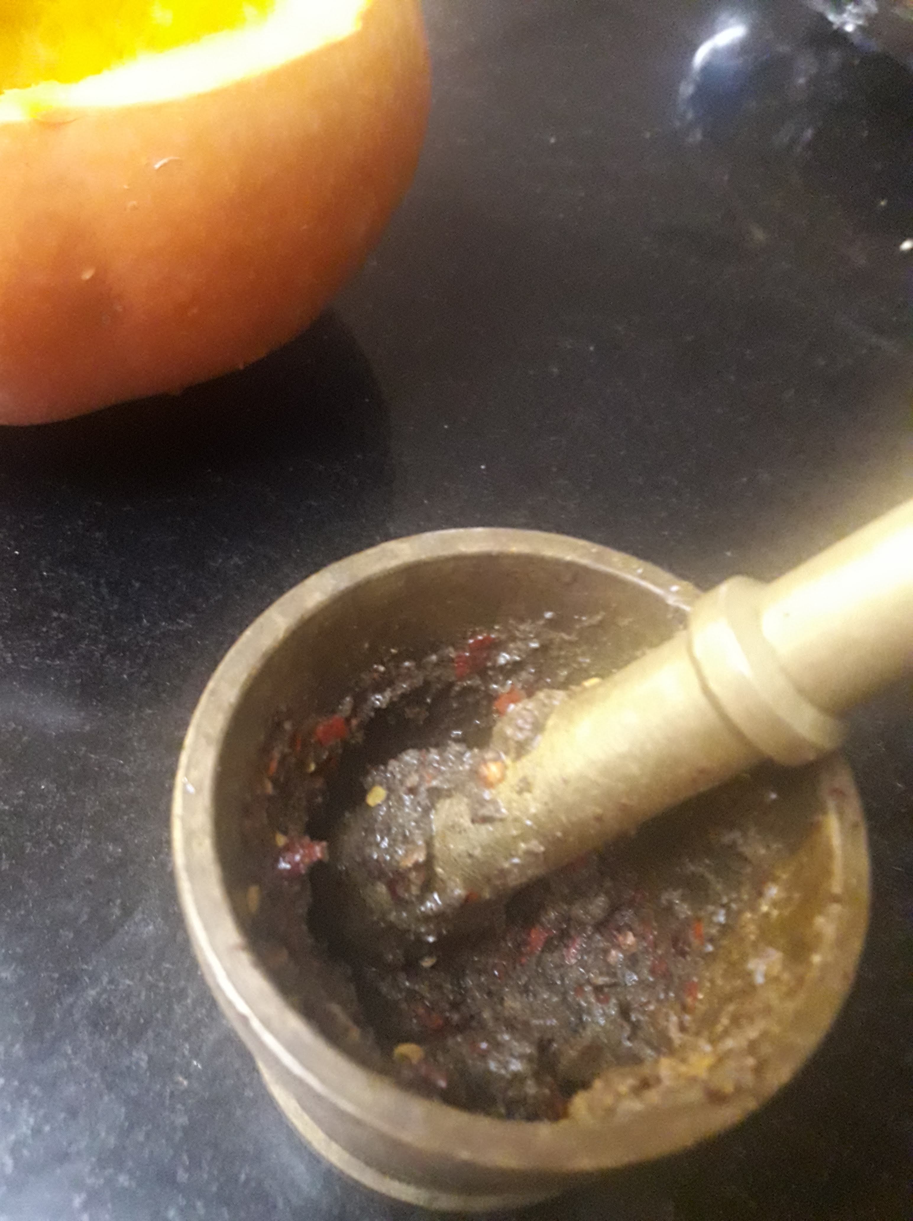 - In a pestle and mortar, add two cloves of garlic, chilli, cinnamon, nutmeg, pepper powder and 1 tsp salt. Mash it with 1 tsp of olive oil and make a paste.