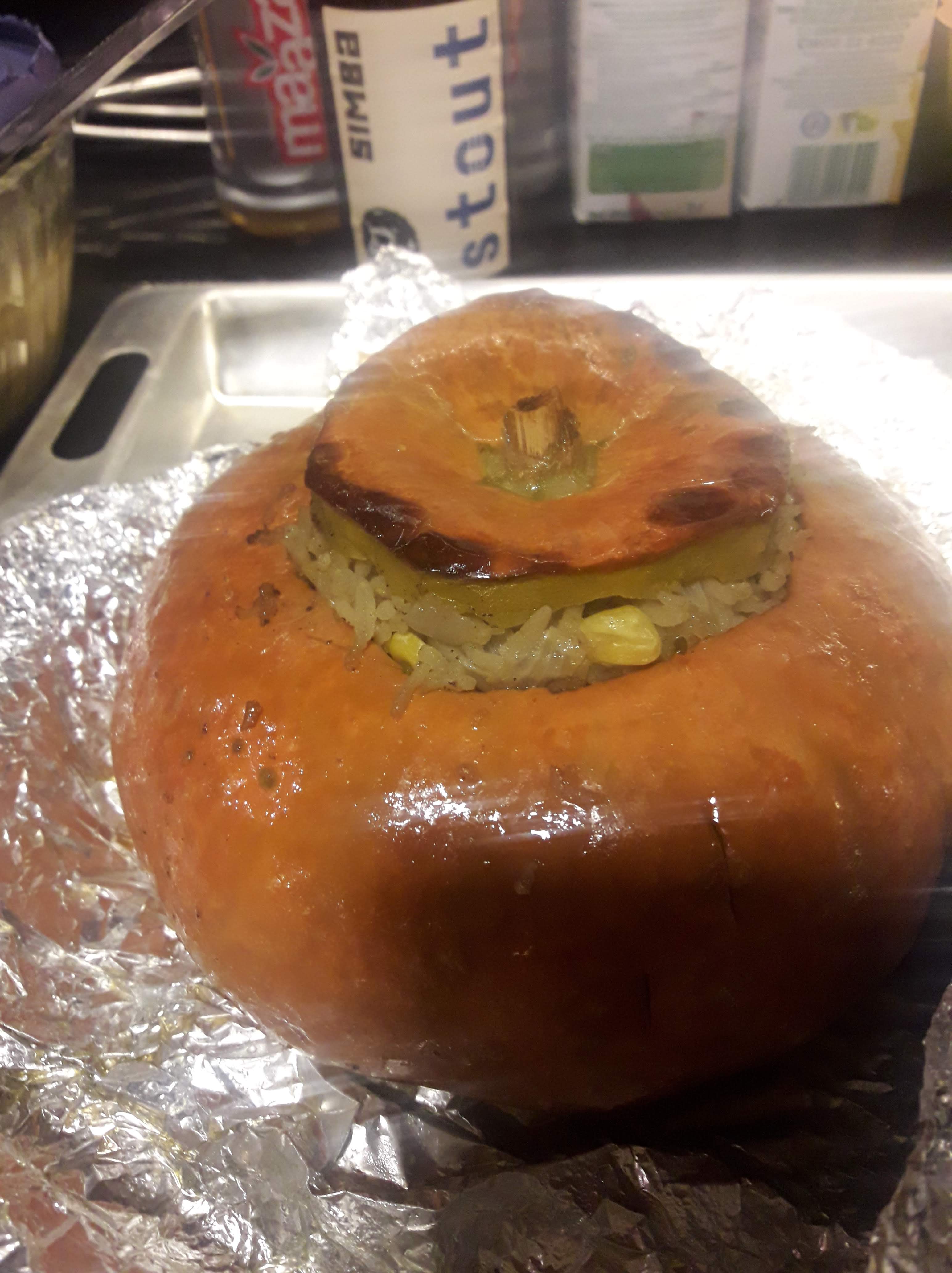 - Spoon in the rice mixture into the pumpkin and cover with the lid.