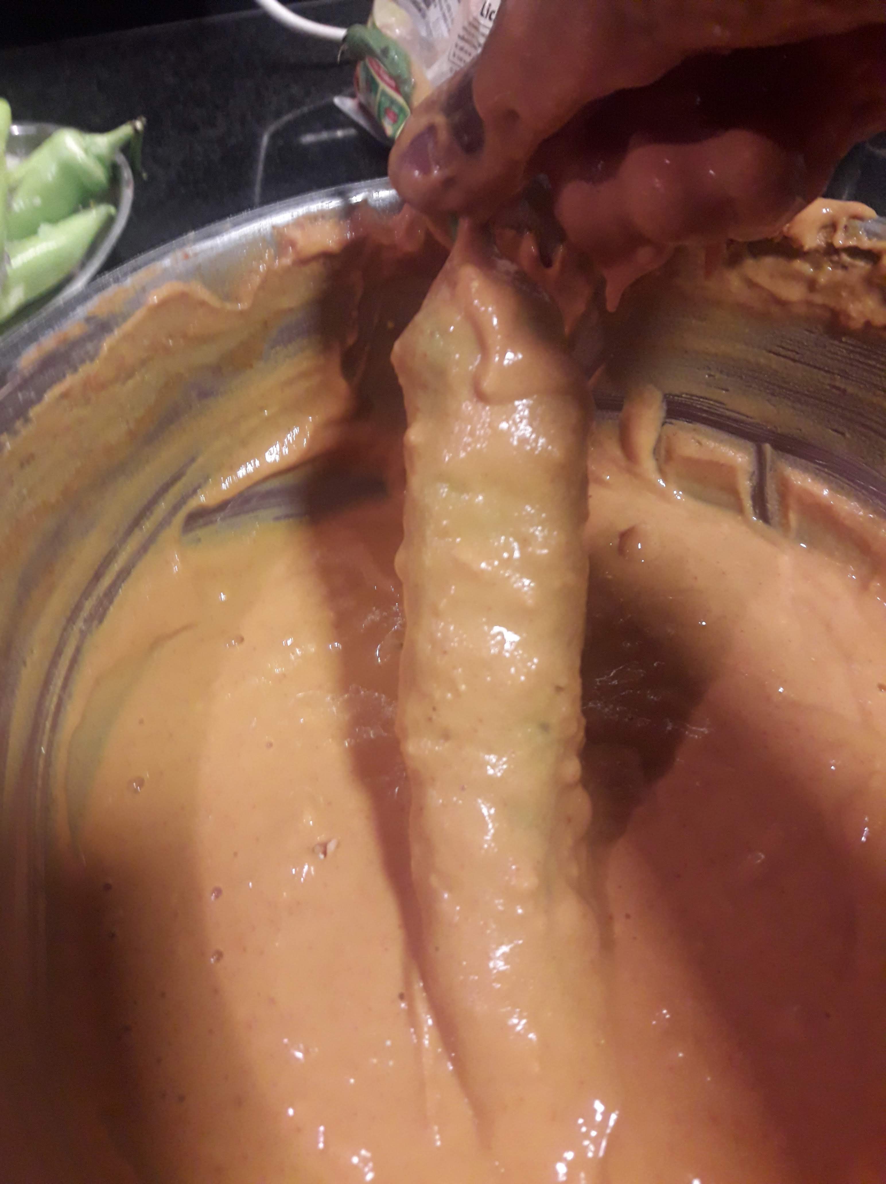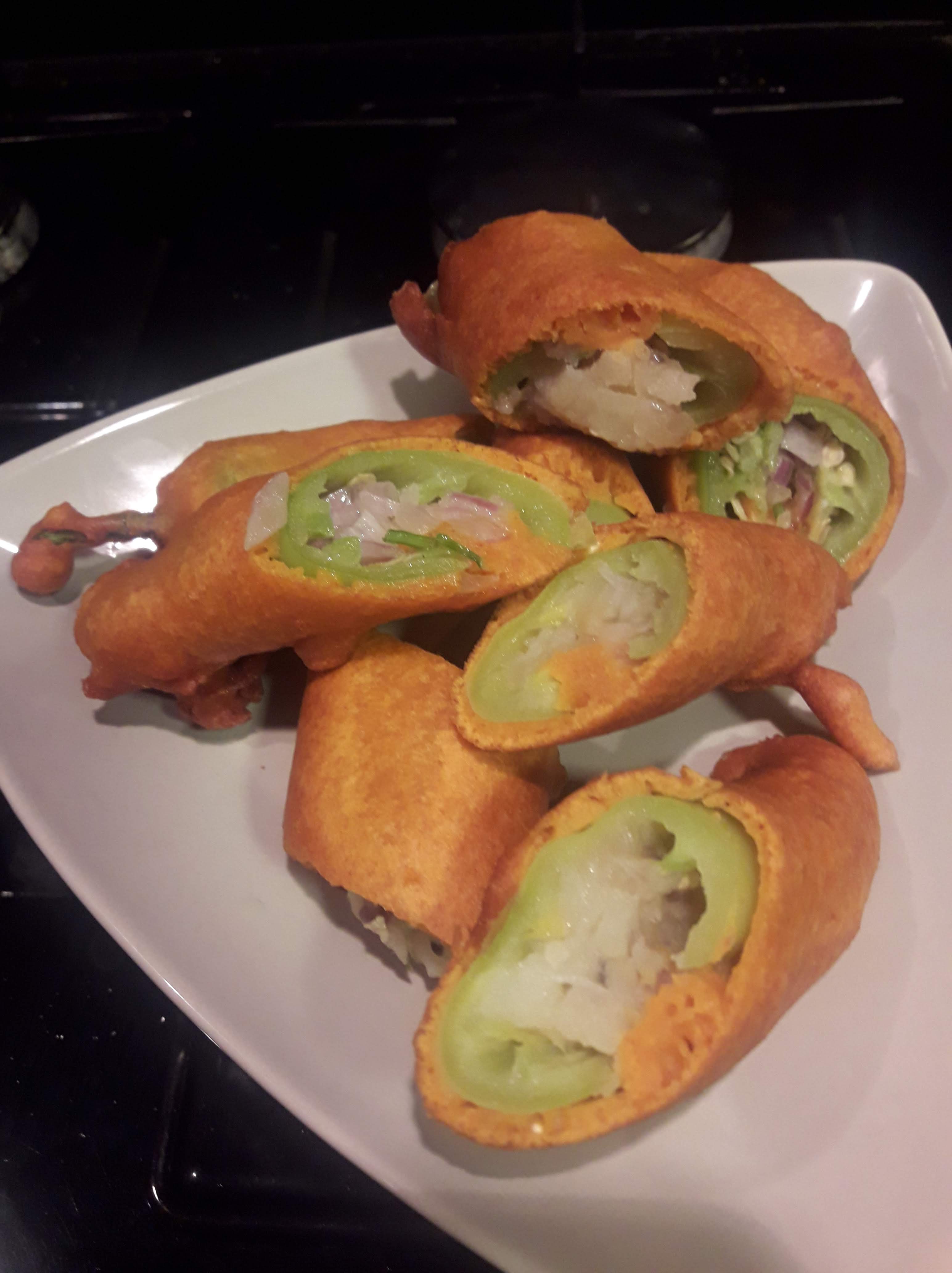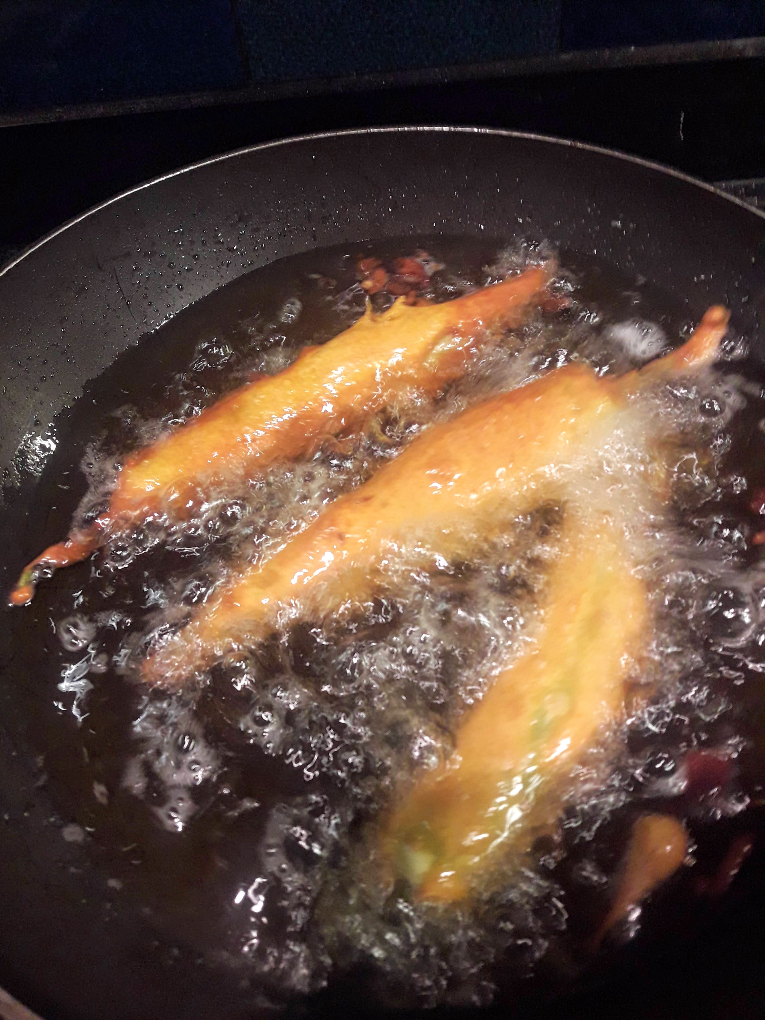 - Dip stuffed chillies into batter and deep fry till golden brown. Turn every few minutes to make sure they are golden on both sides.