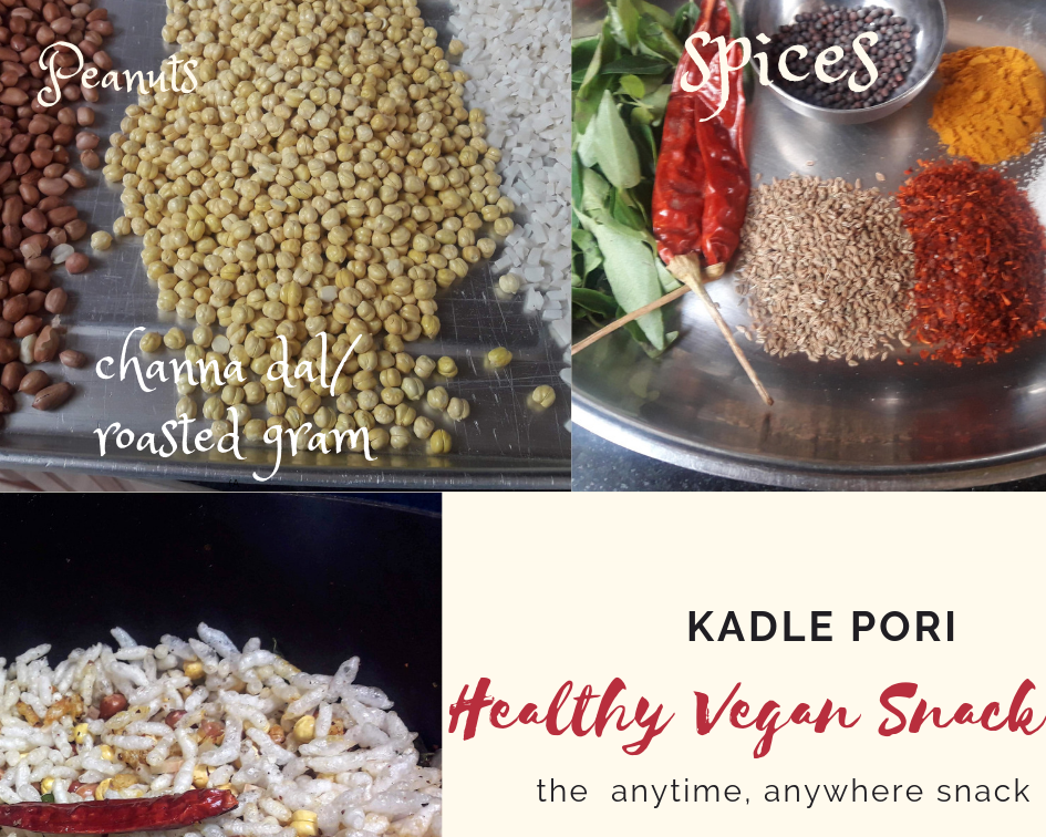 Kadle puri or pori is a snack which is healthy as it is made up of puffed rice, peanuts, roasted gram and some spices. It is an easy to carry snack which can be eaten anywhere and at anytime. Carry a bag of this to work and munch on this instead of chips. This has a crunch and is savoury so feels like you are eating chips. Make a big batch and store in an airtight container. Puffed rice can be found in most indian stores/ supermarkets.