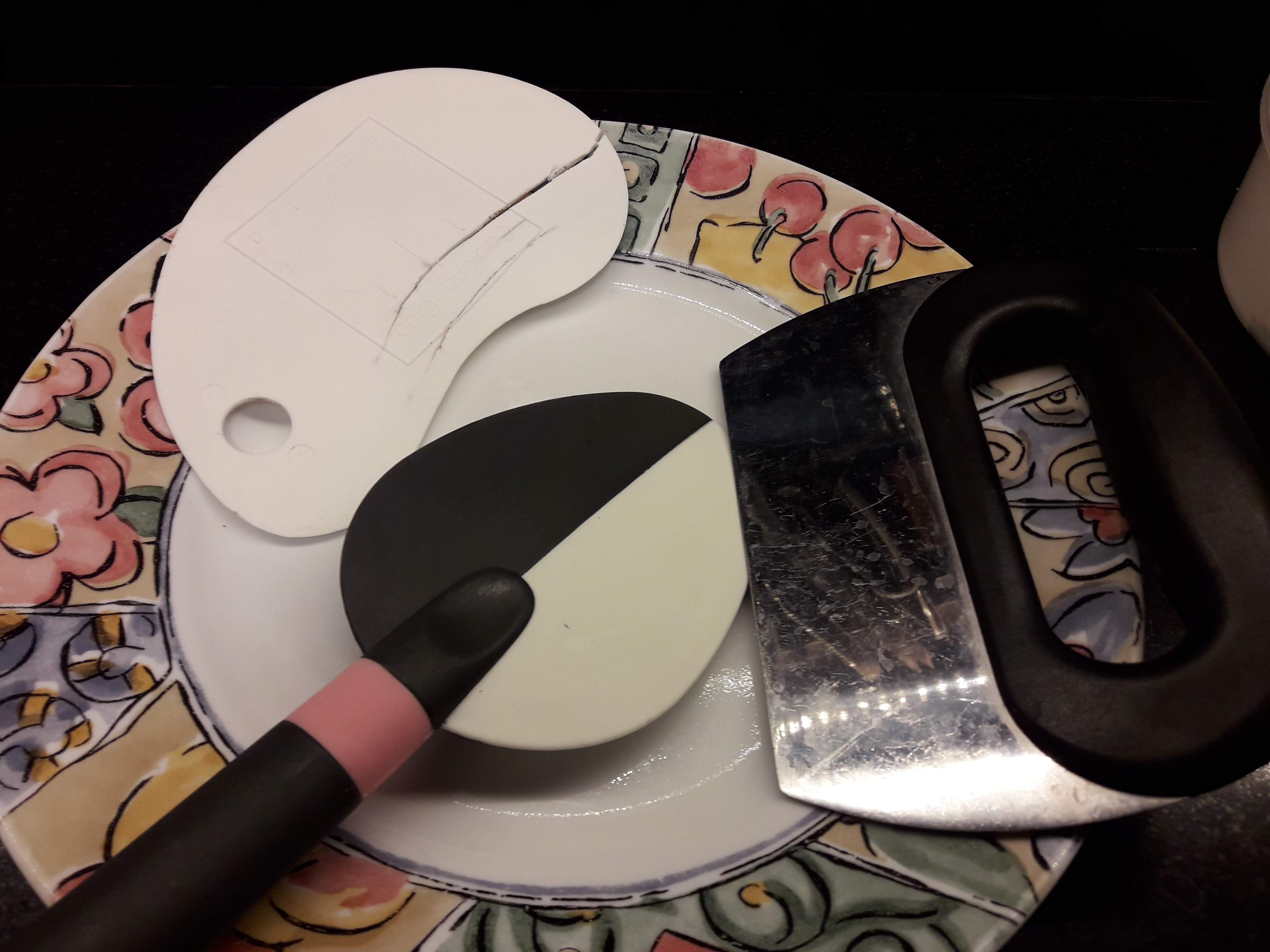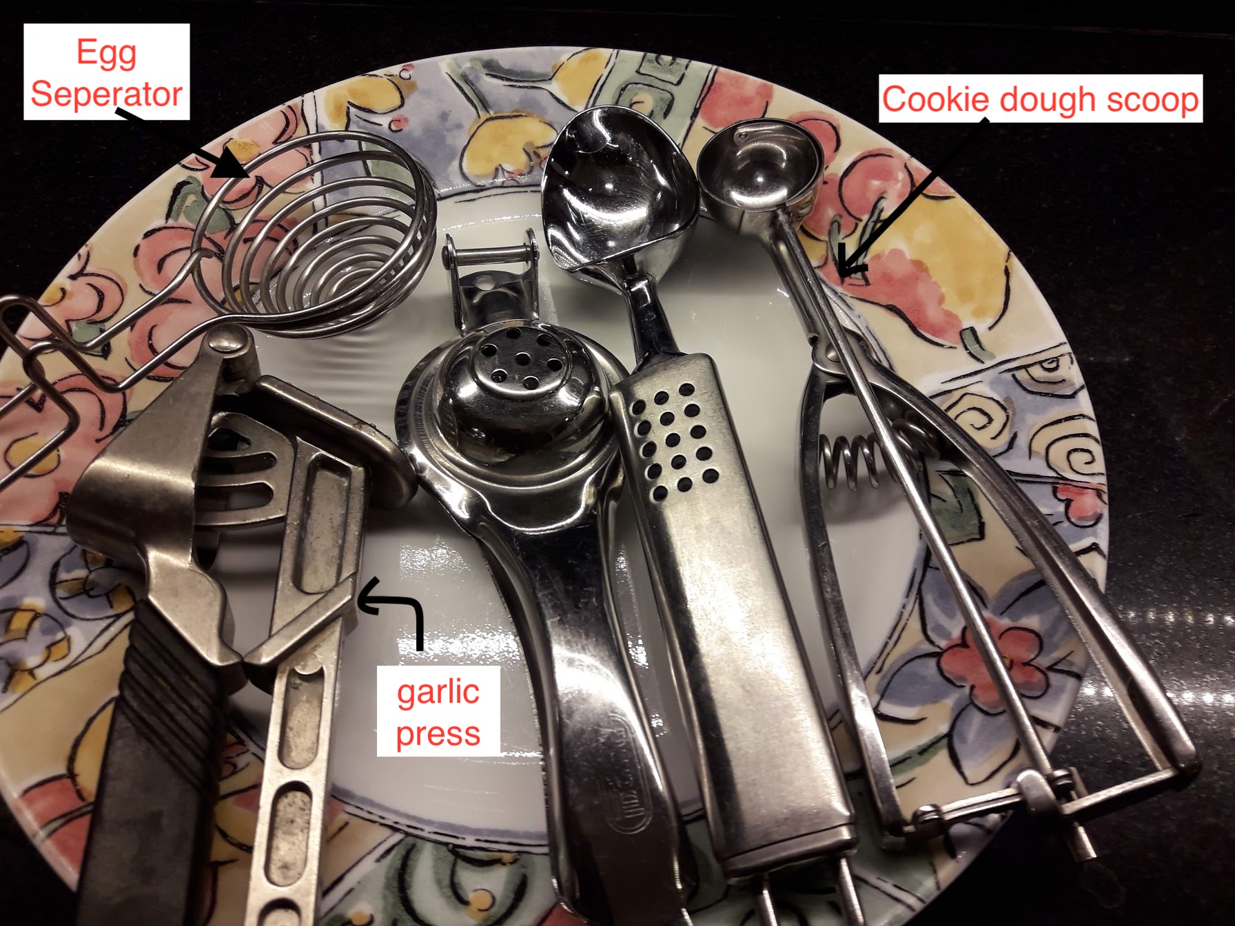 More kitchen tools: I use all of these, except for the garlic press (I use it to pound or break nuts but rarely for garlic). The one on the left is an egg separator. My husband, when he makes egg white omelettes for me, uses this as he does not like to touch the egg. The yolk stays on top and the egg white falls into the bowl. I just use my fingers. The cookie dough scoop is really useful while making cookies to get the same amount and cookie size.