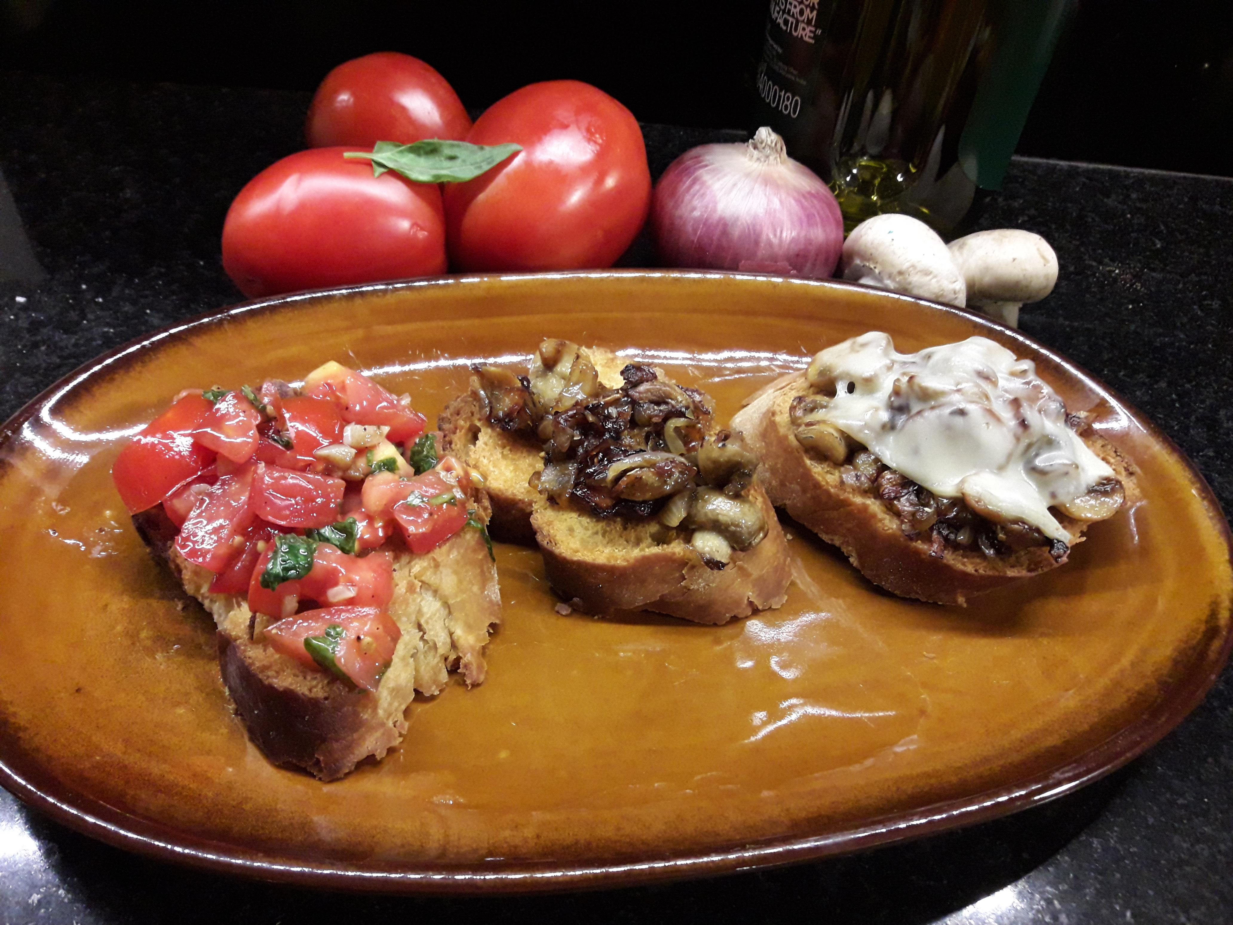 Here I have two recipes, Bruschetta with Sauteed Mushrooms and Bruschetta with Basil and Tomato, Drizzled with Balsamic.