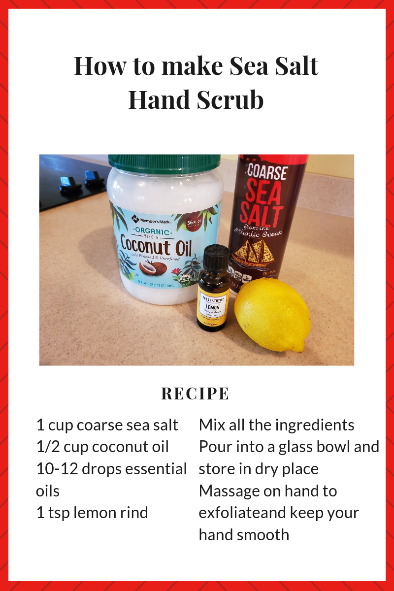Last month, we visited a brew pub which had a scrub made up of hops, lemon and salt. I came home and wanted to replicate it. The coconut oil moisturizes and the salt exfoliates the skin. The sea salt should be coarse but not too big. You can use regular salt too. I used lemon essential oil but you can use any oil you would like.