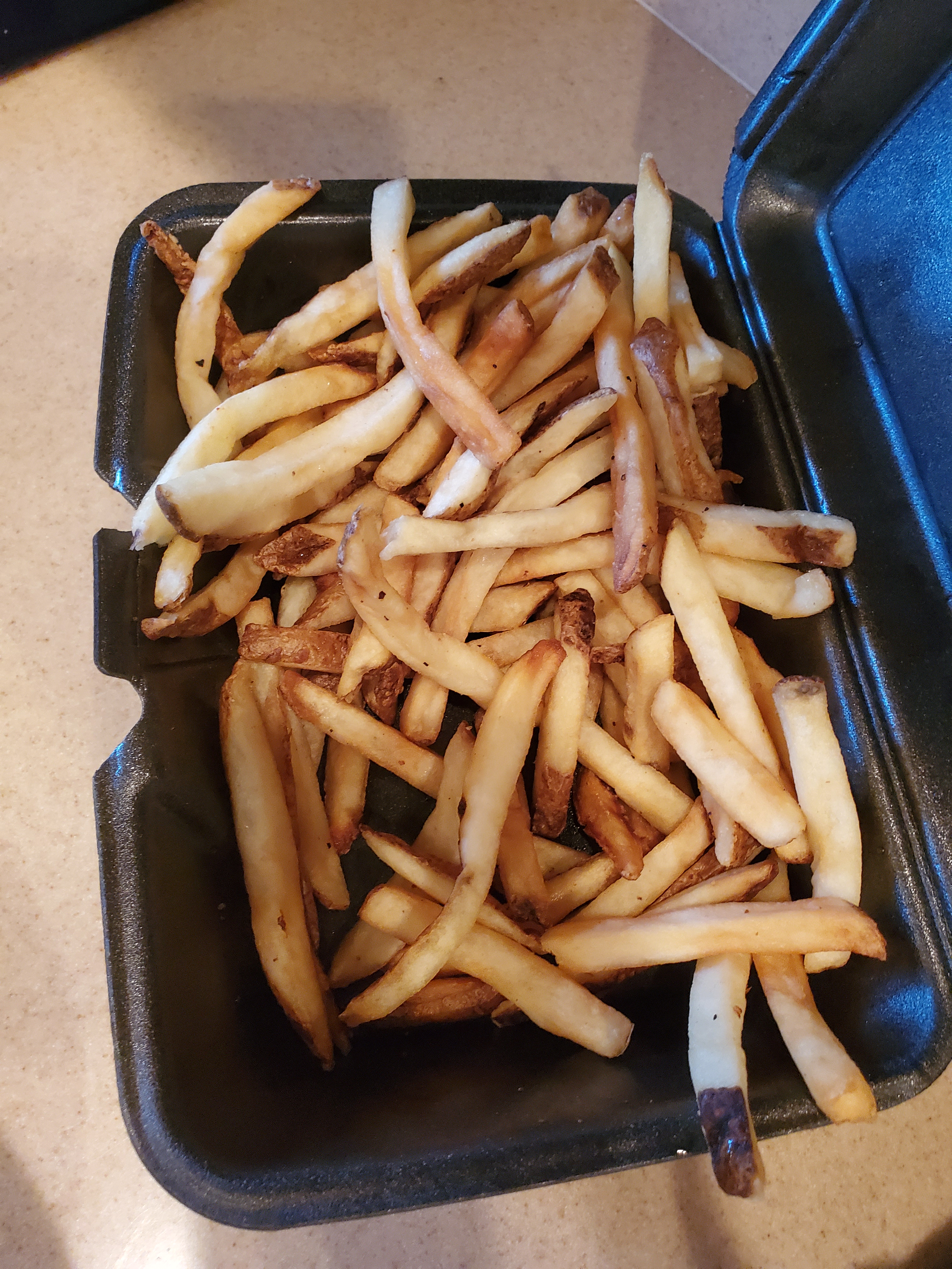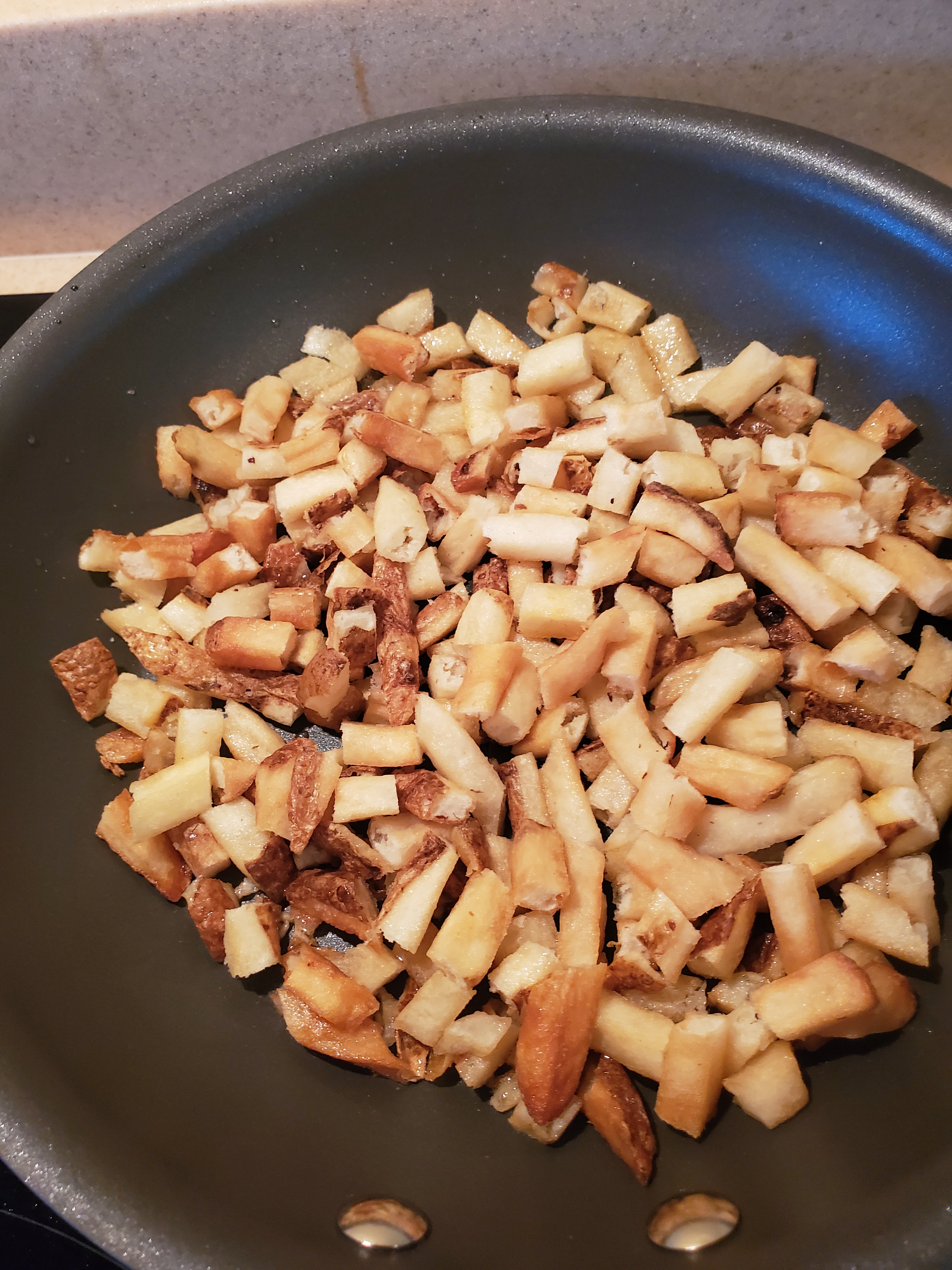 Spread fries on the skillet and and let it sit on medium flame for a few minutes to crisp up