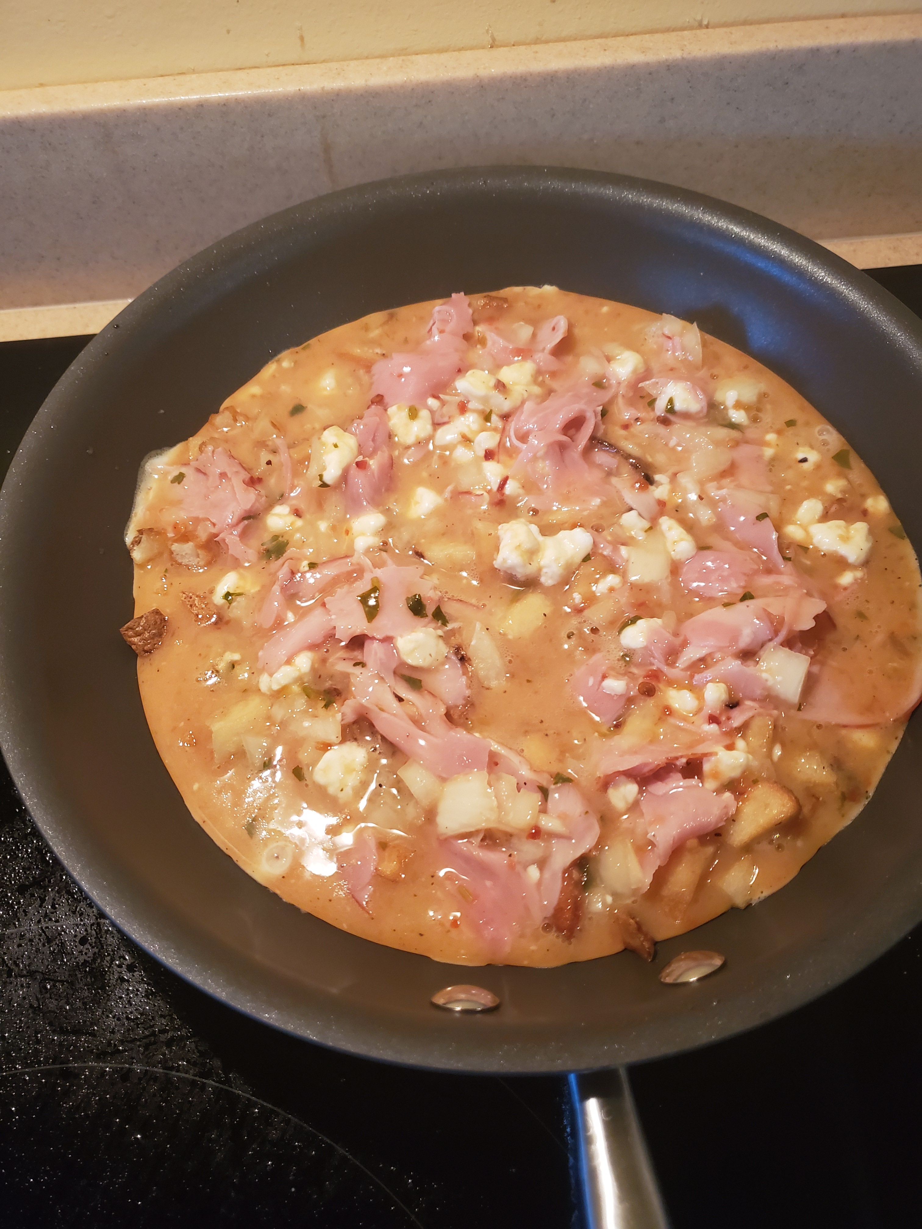 What would you do with leftover fries? You could fry it again or crisp it in the oven, or make a frittata. I have made frittata before with noodles, mushrooms or sliced potato. When I googled ideas for leftover fries, I saw ideas for frittata. Threw in a few things together and a dish is made! You can follow the same recipe and instead of fries, you can add leftover noodles or thinly sliced potatoes.
