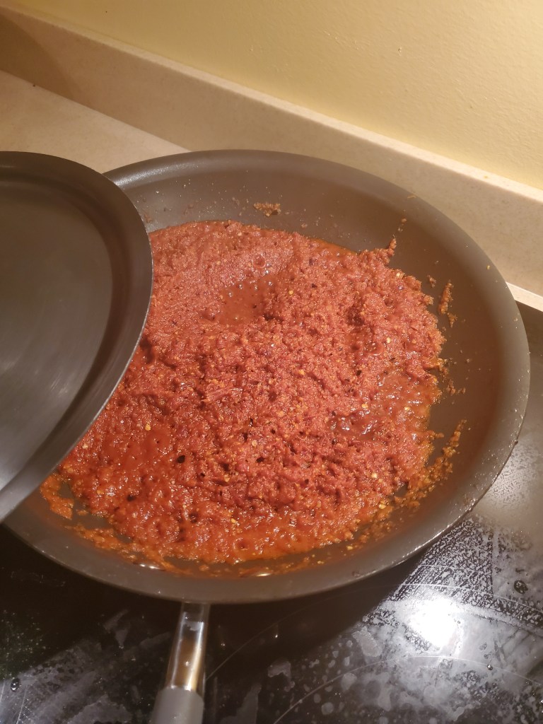 - Place tomatoes in oven for about an hour till it dries out. (My mom dries it in the sun)