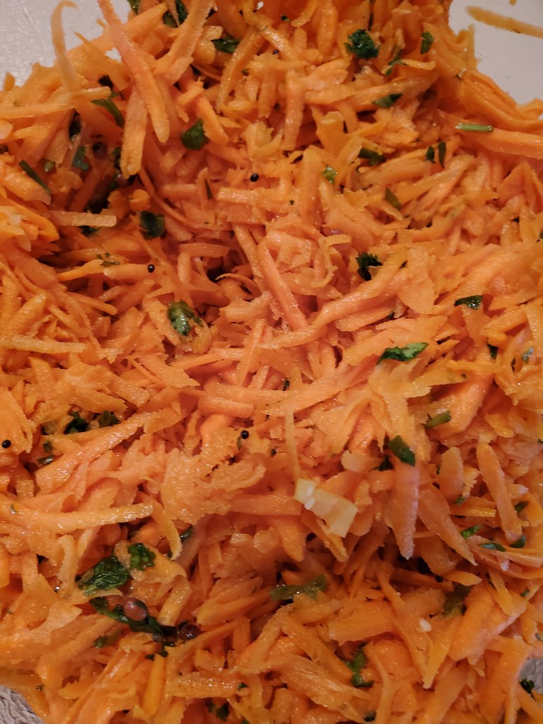 I remember eating this salad at my friend’s house when I was in college. I have been making this ever since. It is easy to make, healthy and delicious. You can serve it as a side or eat it as a main. You could grate some radish with it too, if you like; but I prefer just carrots.