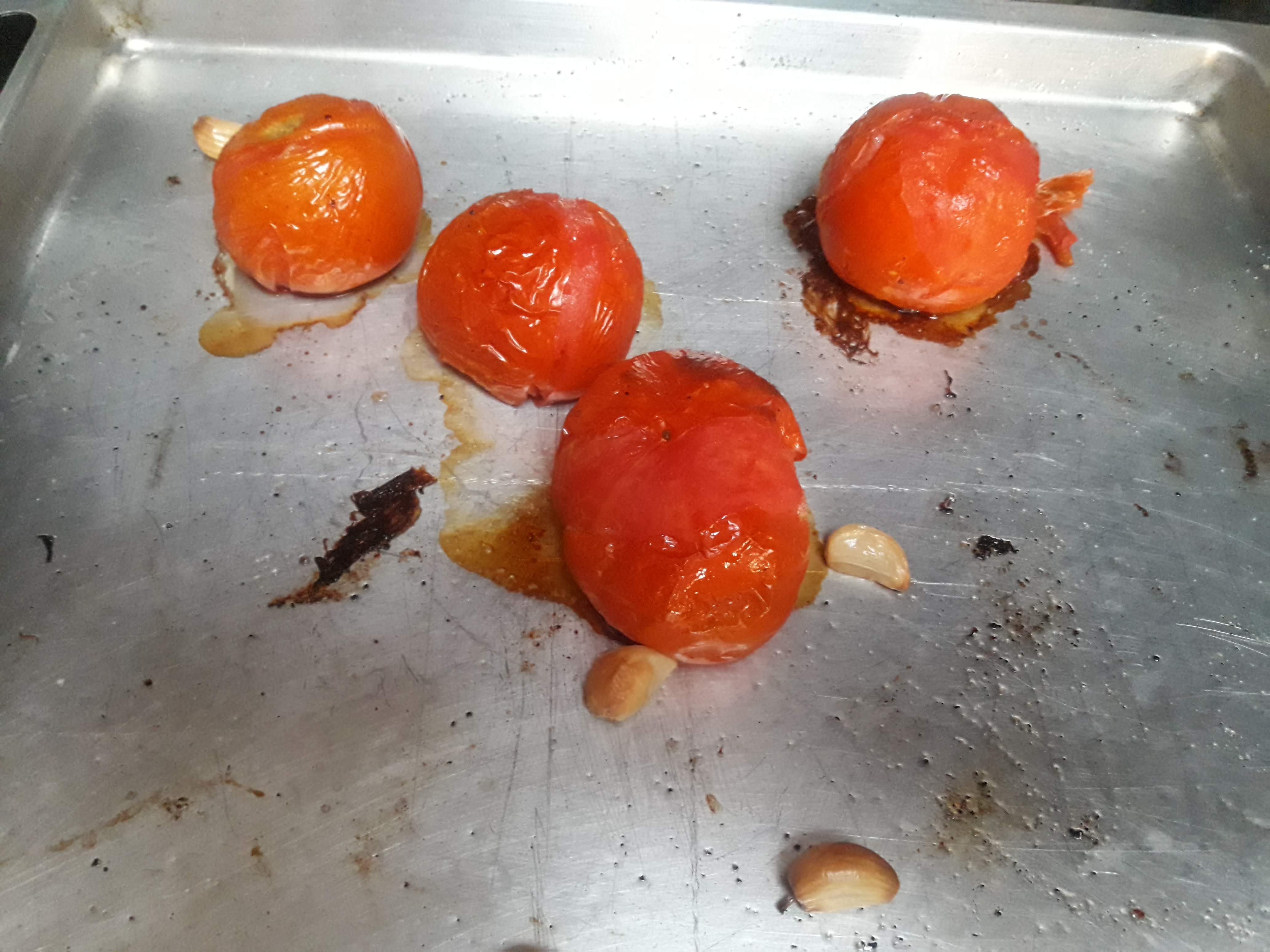 - Grill tomatoes and 3-4 cloves of garlic in the oven. Remove skin of tomatoes (Heat oven to 200ºC/400ºF, grill for 25-30 minutes)
