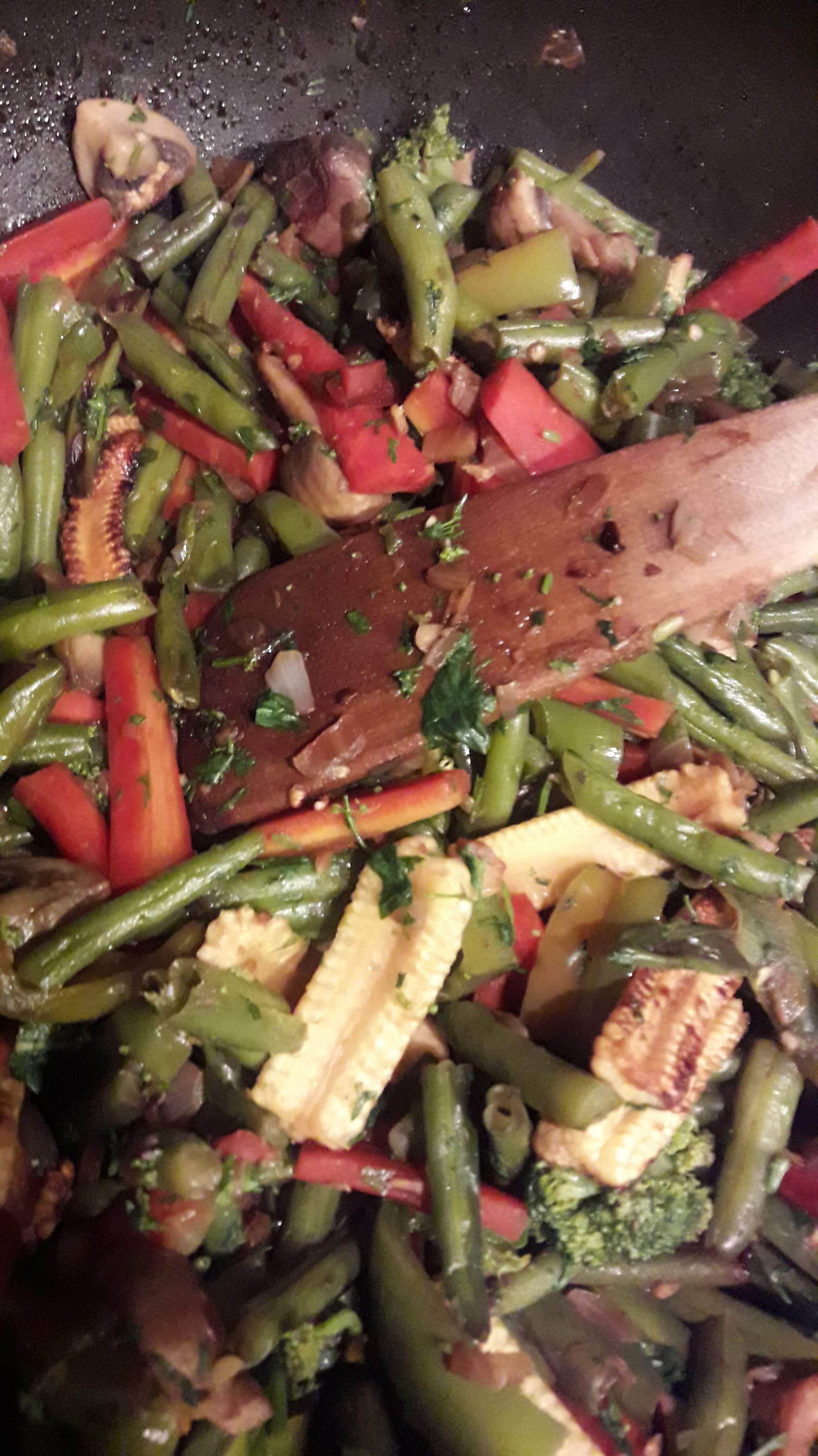 - Add onions and fry for a minute. Add chillies, garlic and ginger. Add vegetables according to their cooking time. Add the broccoli and capsicum last as you do not want them to overcook and get mushy. Add salt