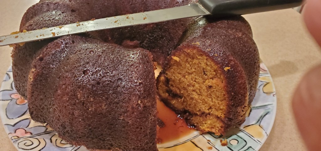 The recipe used a bundt cake pan. I did not have one so made it in a regular pan. I ate a couple of pieces without the glaze. I was not going to make the glaze. It was good without the glaze. I finally decided to make it and then added the glaze. It elevated the cake to another level. This cake is a keeper.