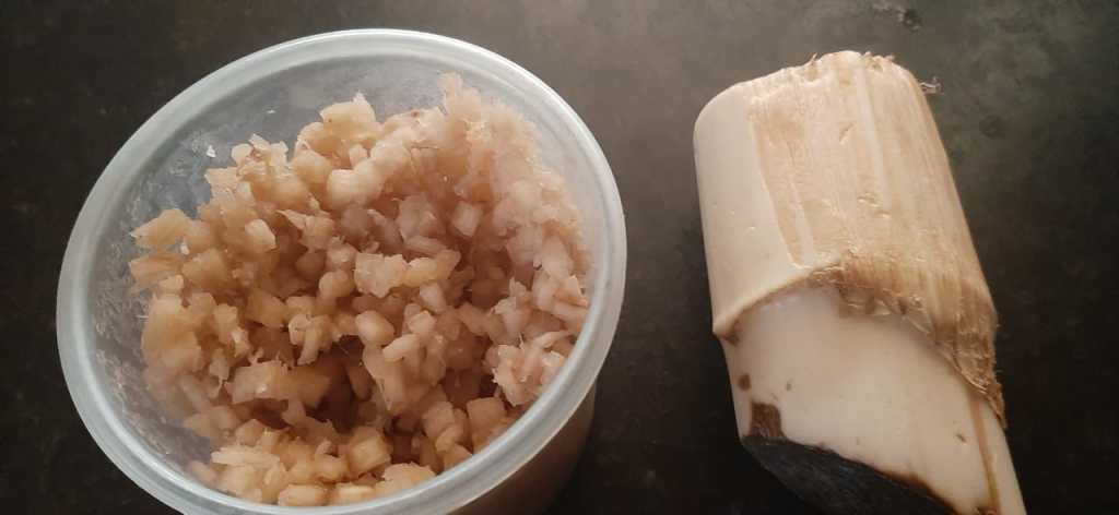 - Pressure cook cut vazhai thandu (plantain stem) in tamarind extract with salt, 1/4 tsp turmeric powder and 1 tablespoon jaggery/ brown sugar