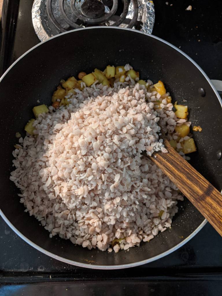 - Once the potato is cooked well and dry, add the poha (beaten rice) and mix gently. Cover and cook on low heat for 2 minutes.