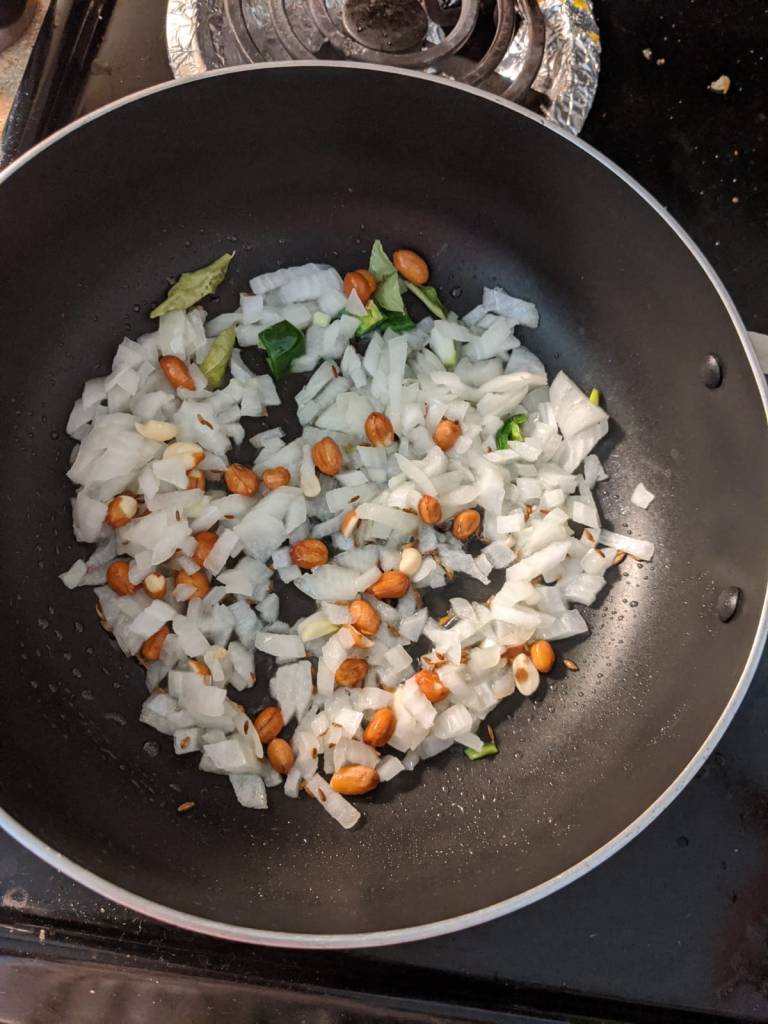 - Add 1 cup chopped onions, 1-2 chopped green chilli (optional), 1/2 cup peanuts, 1 tbsp curry leaves (optional) and saute till onion turns golden.
