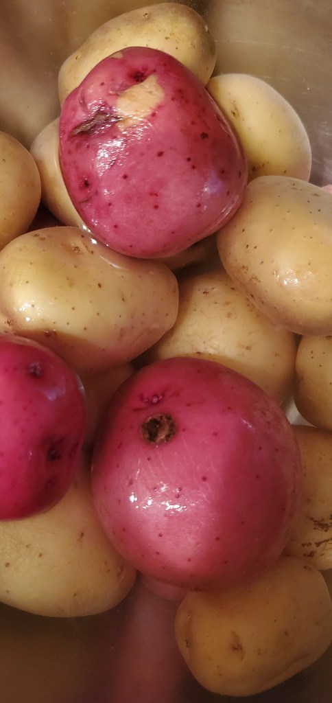 - Wash and parboil a pound of baby potatoes