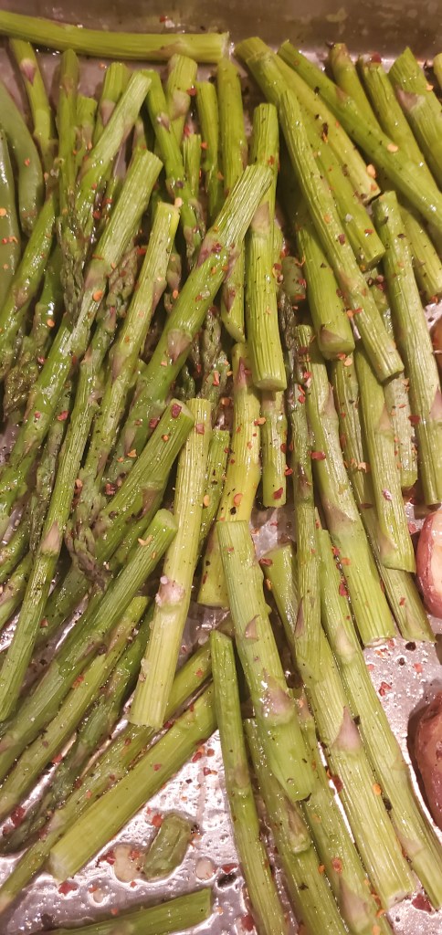 - Toss and add to a greased sheet pan. I sometimes use parchment paper