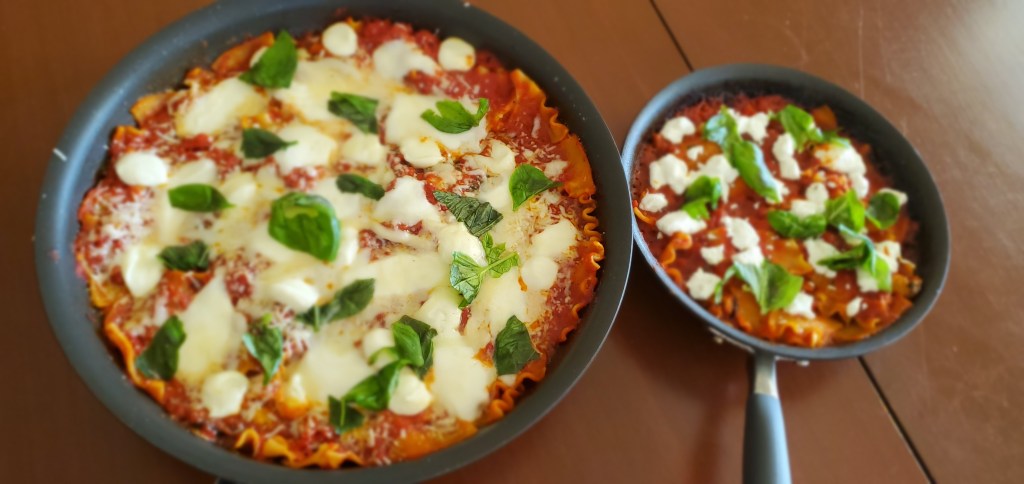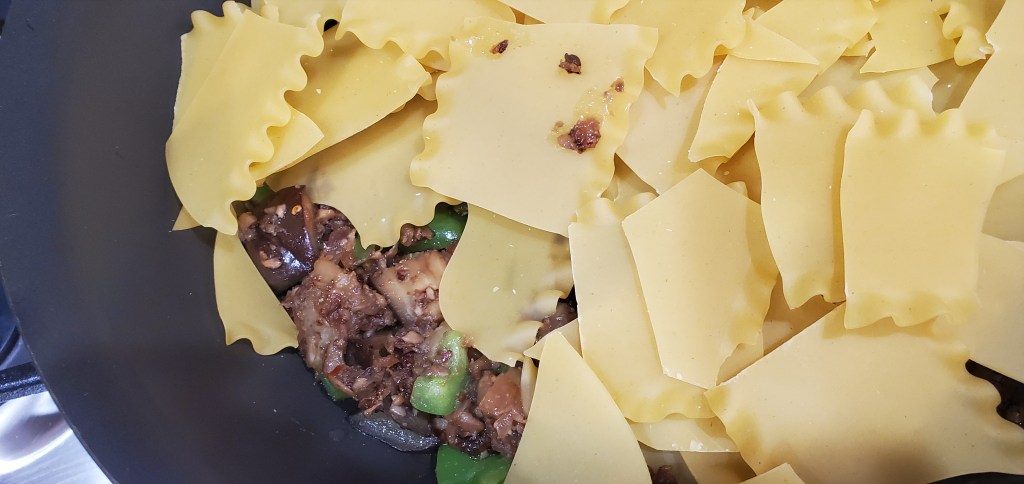 I came across this recipe in another group posted by Phillip Nicholas. His was with meat and ricotta cheese and I adapted it to a vegetarian version with teh cheese I had at home that day. It was easy (no pre-boiling of pasta sheets, layering or baking), all in one skillet and delicious. This recipe is a keeper!