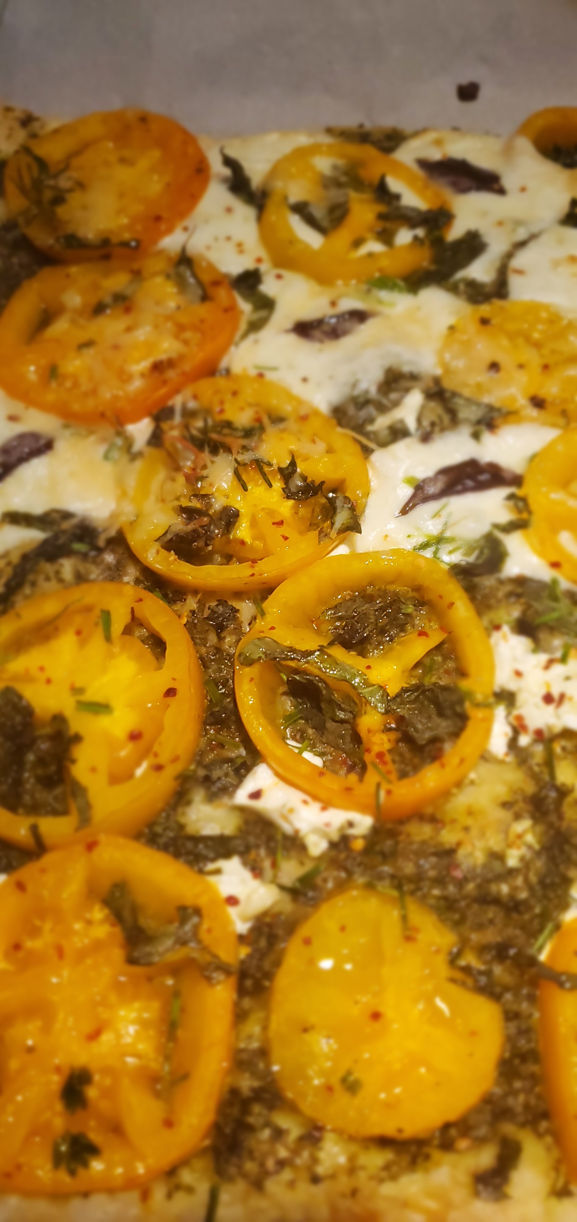 I saw a post in a food group of a tomato tart. It looked scrumptious and I decided to make it for dinner. I usually keep some puff pastry in the freezer and so this was one of those quick weekday dinners. Pair it with a salad if you want. Since I cannot eat cheese and can tolerate some goat cheese, I made a quarter of the tart without cheese and sprinkled some goat cheese and even the cheese eaters enjoyed that part. If you are vegan, leave the cheese out. I always make my pesto with no cheese (Oh my!) and then whoever wants cheese adds cheese on it. For vegan options, leave cheese out or use vegan cheese