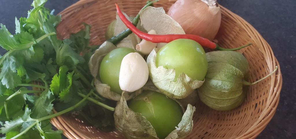 Tomatillo is my new favourite vegetable. It looks like a green tomato but has a husk around it. When the husk is removed, you see a vegetable that looks like a green tomato. It is sticky and needs to be washed. The taste however is very different. It is more tart than a tomato. I would say it has the taste of a raw tomato and amla (gooseberry ) combined. It has this wonderful tart and slightly sweet taste and you could whip up a salsa in no time. The salsa thickens the next day. I tried it with dosa the next day and it went really well as a chutney. I have used raw tomato as a substitute with some extra lemon juice but would next time throw in some gooseberry or a piece of raw mango instead.