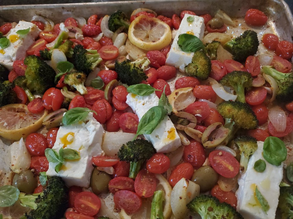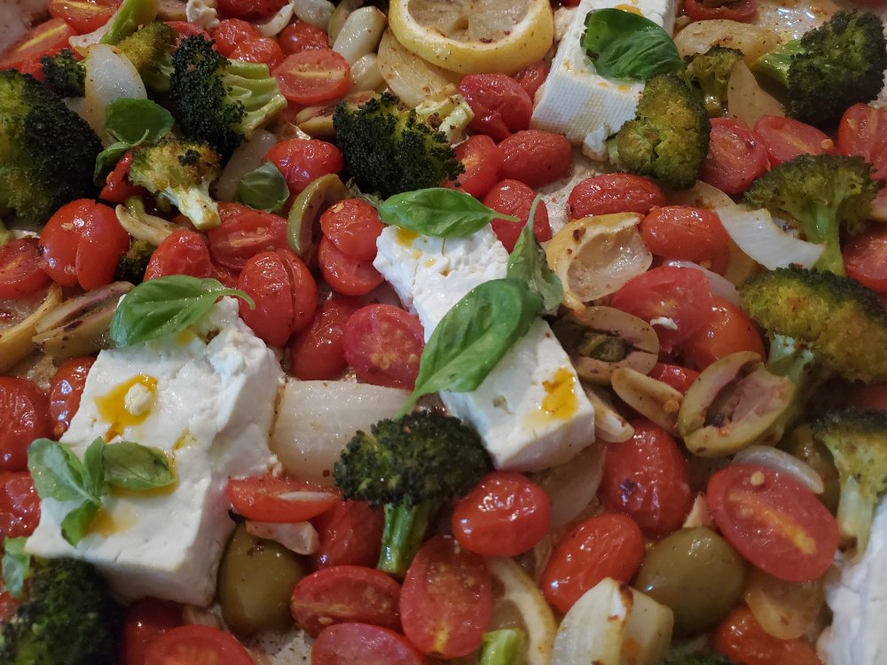 I have made this 2 ways. In one it is just feta, tomatoes, garlic and olives; the other has broccoli and is a more complete meal.