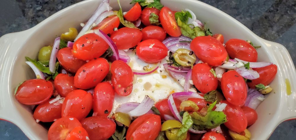 If using just tomatoes and cheese, use a small oven proof dish. Season tomatoes, add olives, onions and garlic and nestle feta cheese in the dish. Bake for 15-20 minutes.