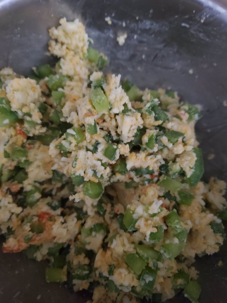 - In a bowl, add cheese, chillies, bell pepper, garlic, coriander leaves and 1 tbsp butter. Mix uniformly