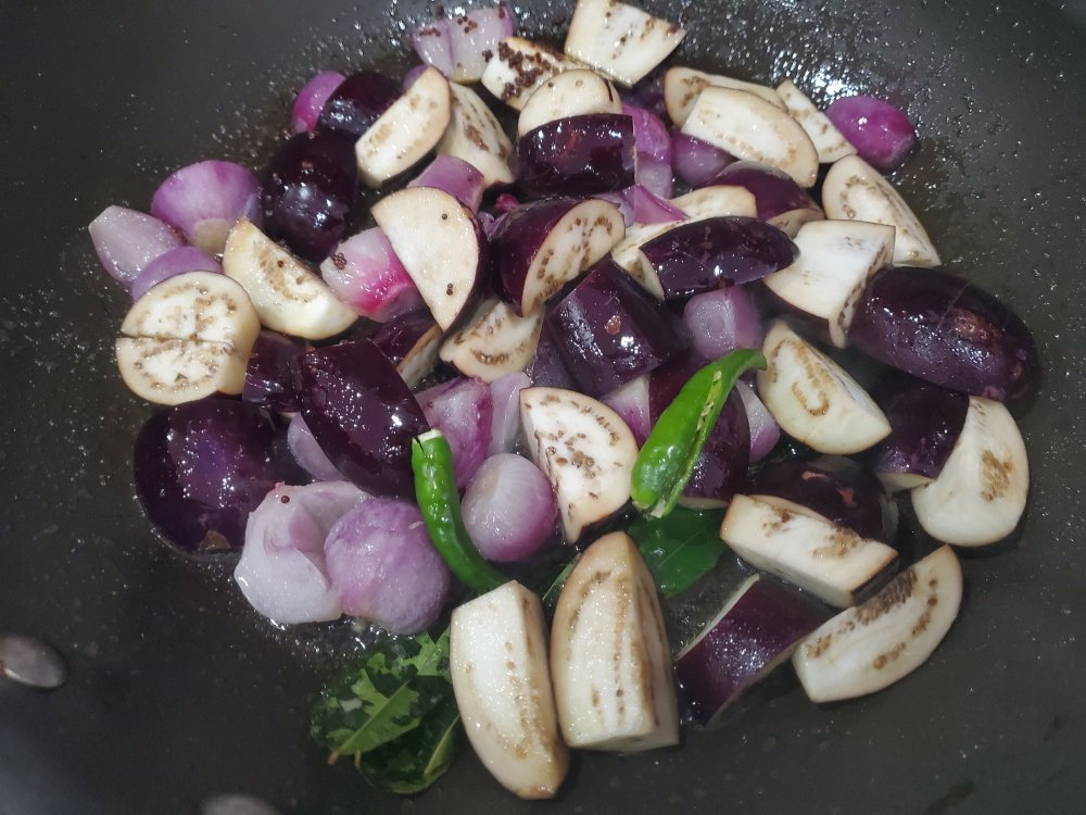 - When mustard seeds splutter, add scallions (sambar onions), eggplant and green chillies and fry on low flame for about 10 minutes