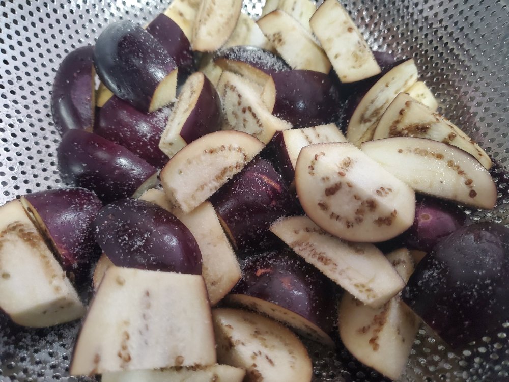 - Cut eggplant into pieces. Add some salt and let it sit. Rinse and keep aside