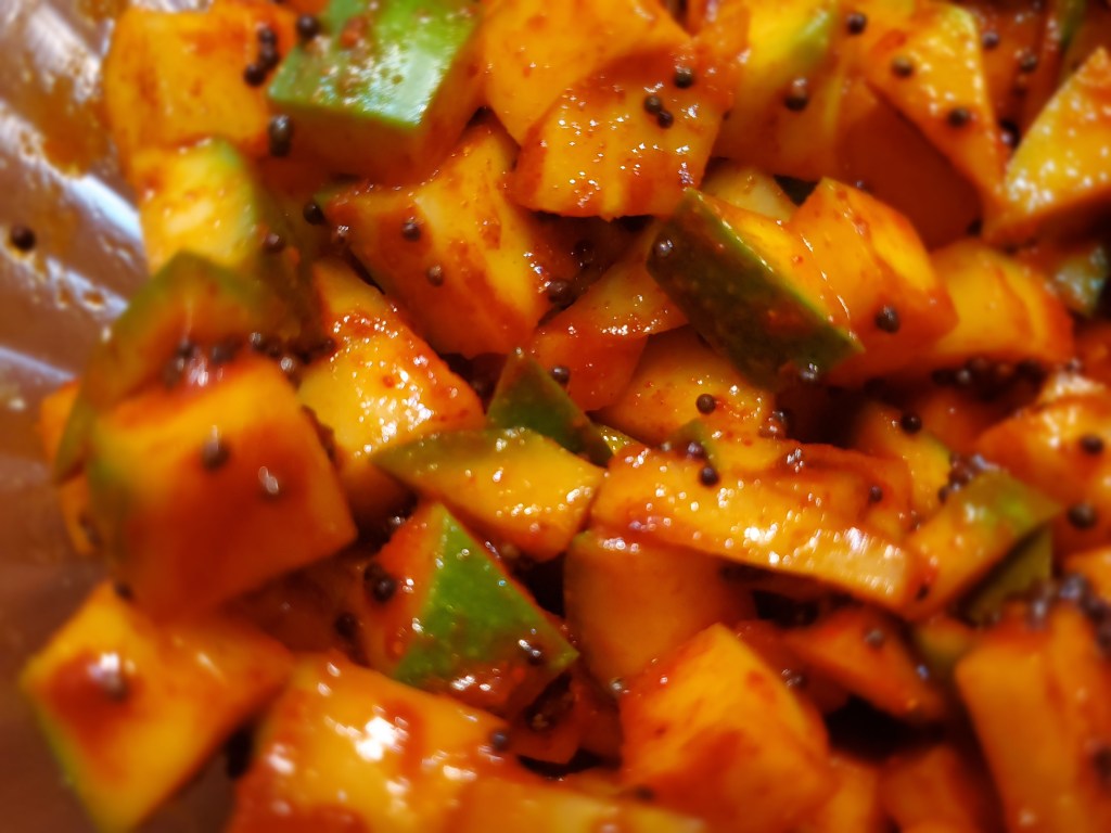 When summer comes by in India and it is mango season, we eat mangoes for breakfast, lunch and dinner; as dessert, as a curry or a condiment. Pickles are made and are stored and used through the year. There are mango varieties like aavakai or vadumangai (baby mangoes) which are used for pickles. My mother makes many bottles of pickle which lasts throughout the year. This recipe , however, is a quick pickle. This is a quick pickle which is eaten the same day or lasts for a few weeks and needs to stored in the refrigerator.
