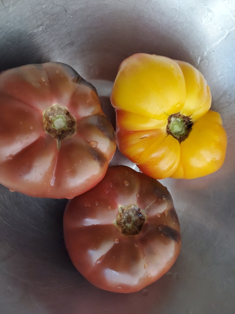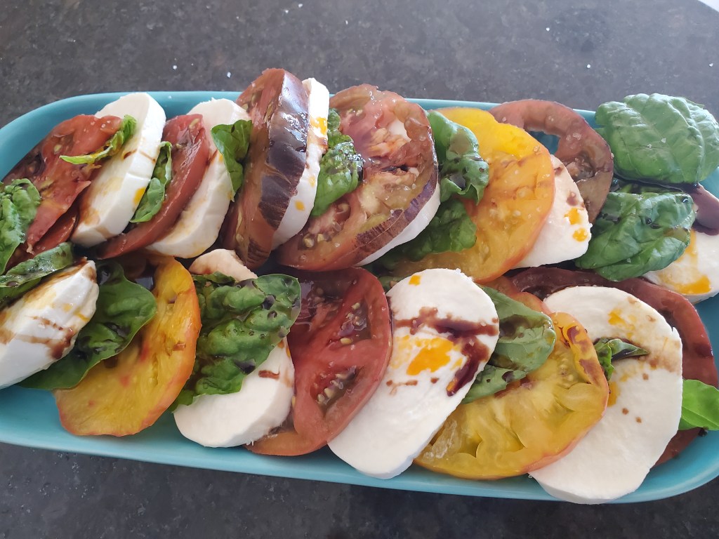 This is a really easy recipe, but requires the best tasting tomatoes you can find. I usually make this in the summer when there is plenty of good tomatoes and fresh basil. Today, I have used heirloom tomatoes from my garden. But any vine ripened tomatoes will do. You need a few basic ingredients for this dish- tomatoes, fresh mozzarella, fresh basil, good extra virgin olive oil, balsamic vinegar(optional), salt and pepper.