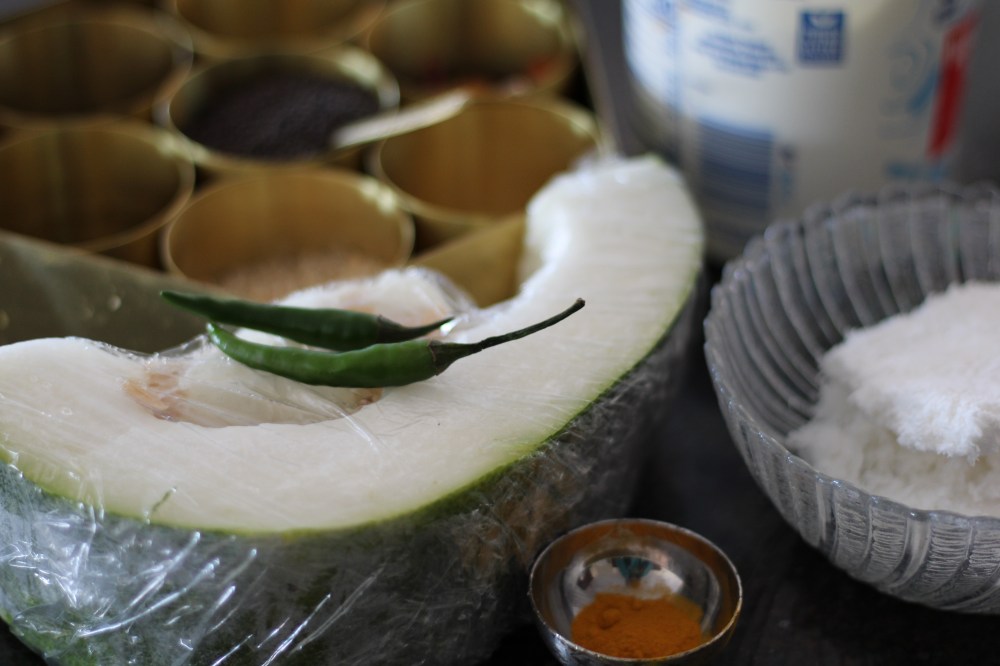 For the morkootan, you can use okra, ash gourd, pumpkin, butternut squash, bottle gourd, chayote squash or mangoes. If you are using okra, you must first stir fry to remove the sliminess. If you want to know more about the science of the sliminess in okra, read this post. Here I have used ash gourd.