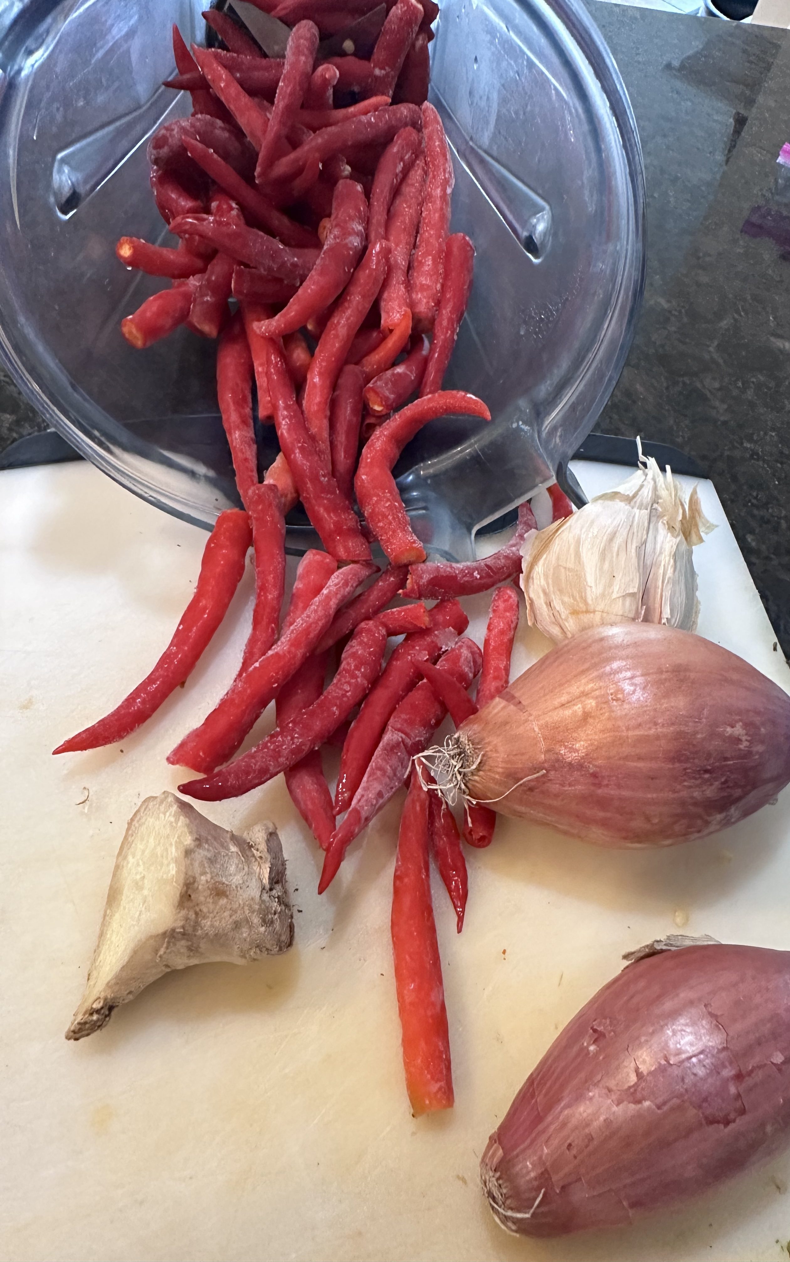 Last year, when I grew a bumper crop of peppers, I ended up with a big bag in the freezer. One day I decided to make sambal—and wow, it turned out spicy but so good. You only need the tiniest spoonful to transform a dish. I use it in all kinds of ways: to spice up anything Asian, stirred into pasta or curries, or even mixed with yogurt for a quick dip. Just a warning: it’s spicy, so start with a little and add more if you dare.