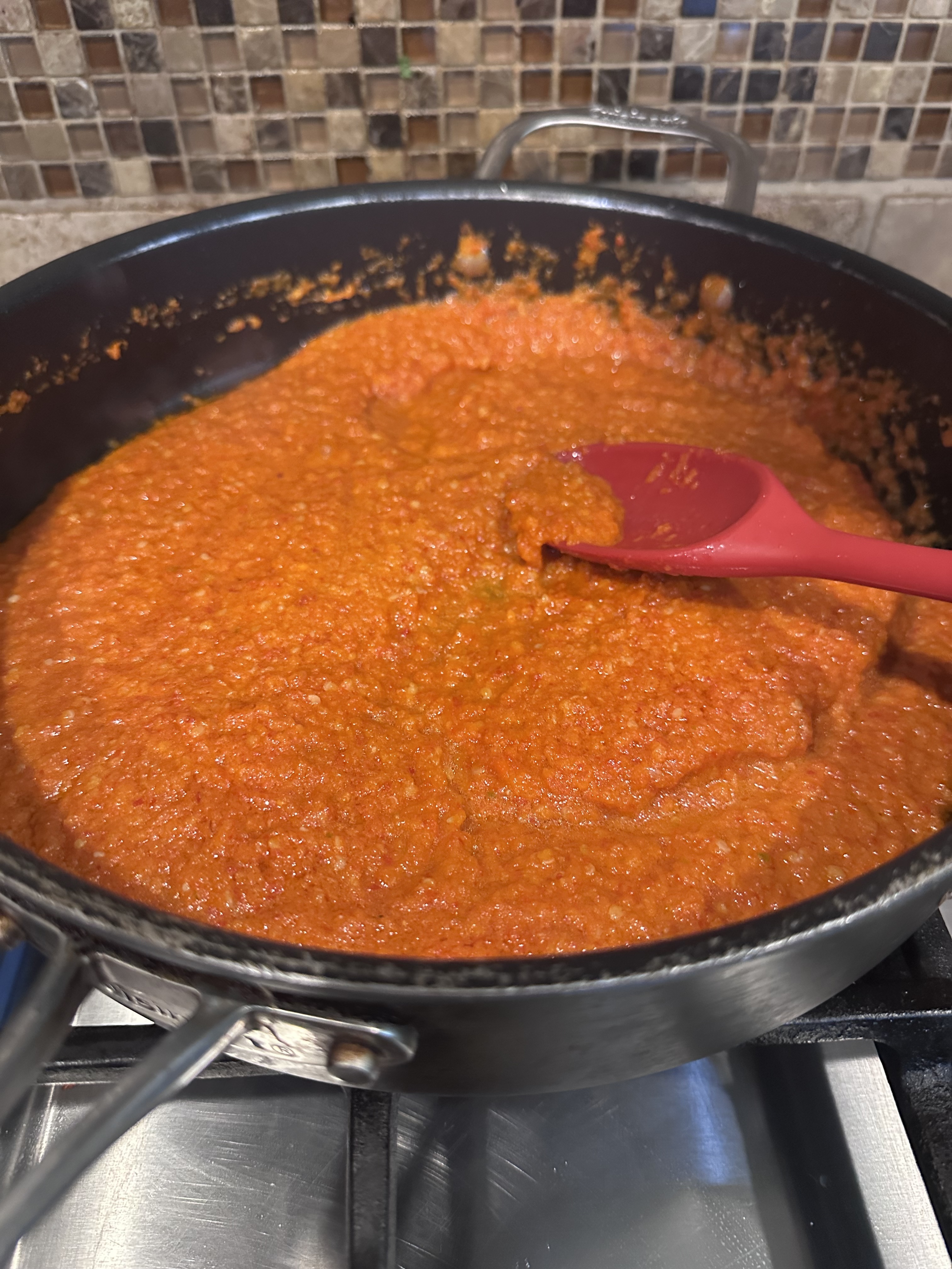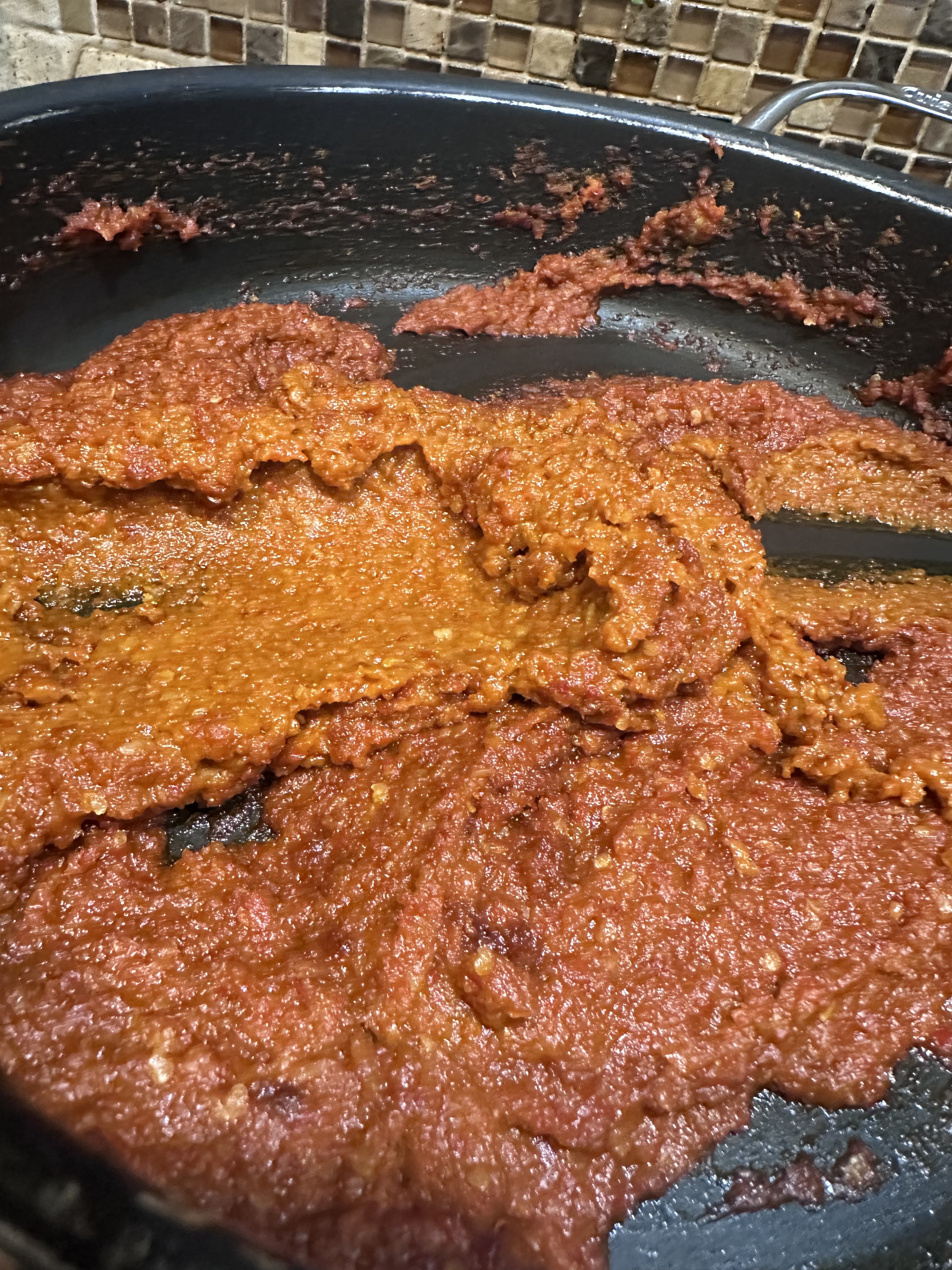 - Cook: Heat oil in a pan over medium heat. Add the paste and cook, stirring often, until the raw smell goes away and the mixture thickens (about 8–10 minutes).